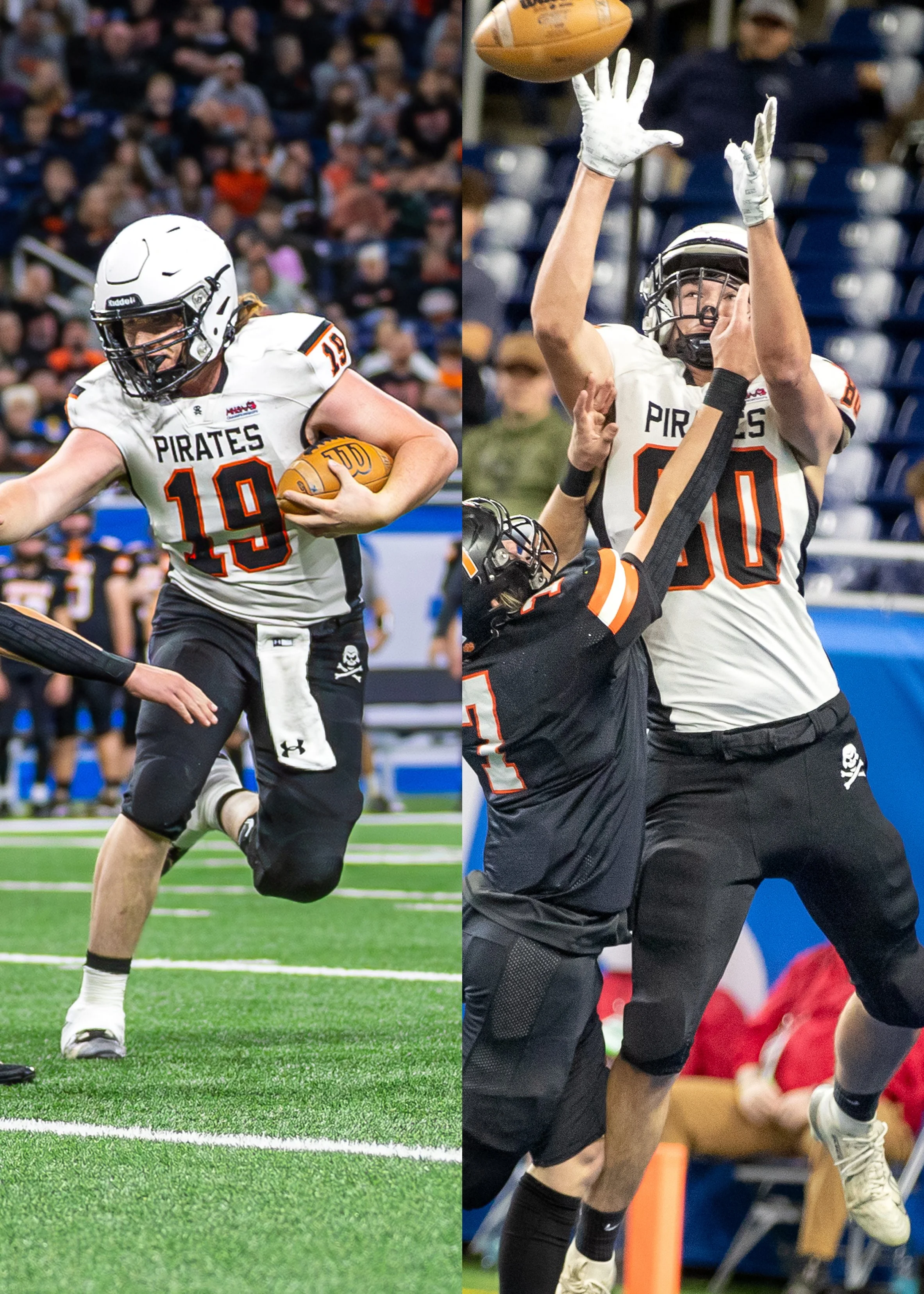 Skiler Kruse brought in three passes, totaling 60 yards, including a 15-yard touchdown. He also ran in a score from 11 yards out, was perfect on four extra point kicks and booted through a 20-yard field goal to put the Pirates up by two possessions with two minutes remaining.
